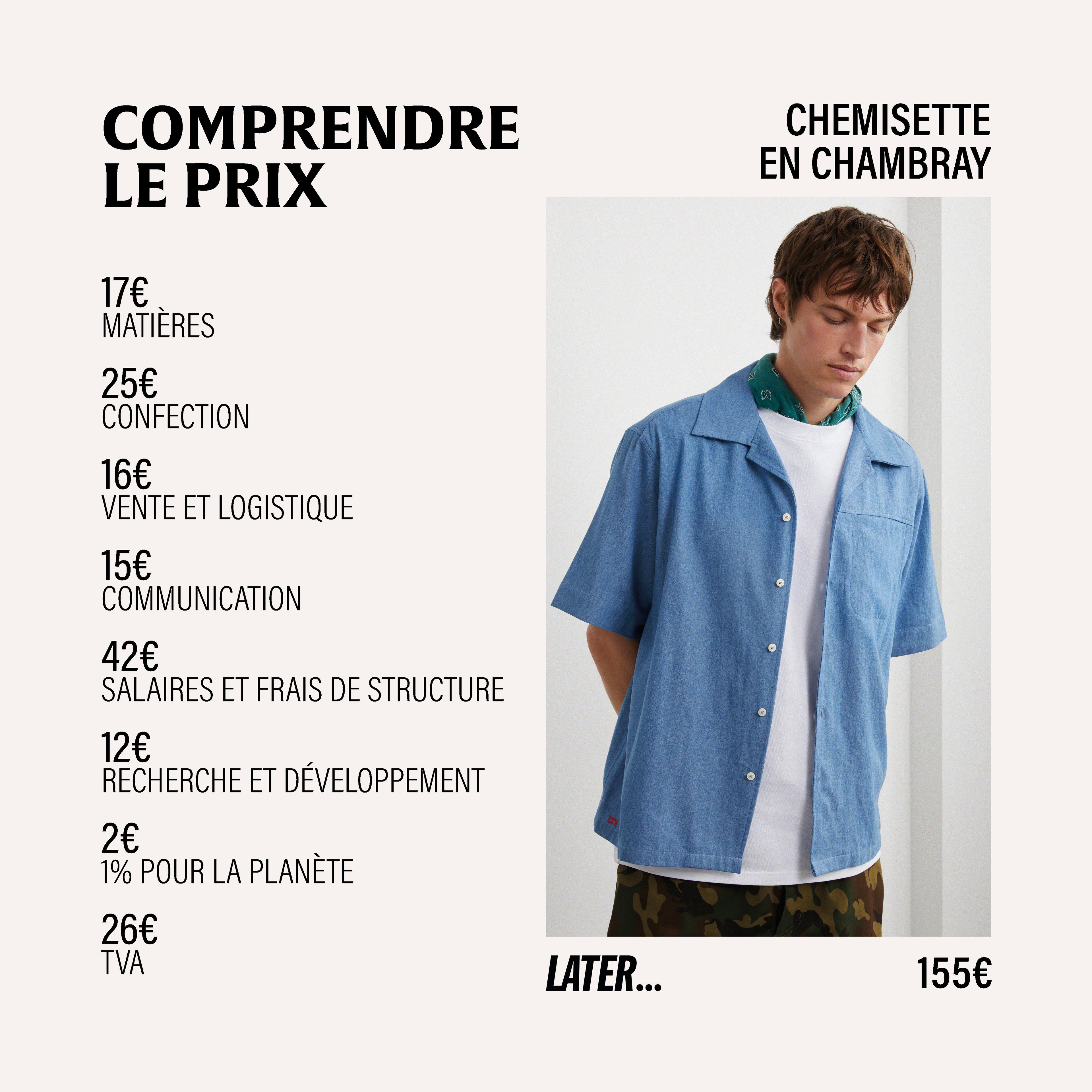 Nous pensons que la transparence totale est une condition nécessaire à une consommation responsable. Le coût des matières, de la confection mais aussi de la logistique et des salaires, on vous explique le prix en détails.