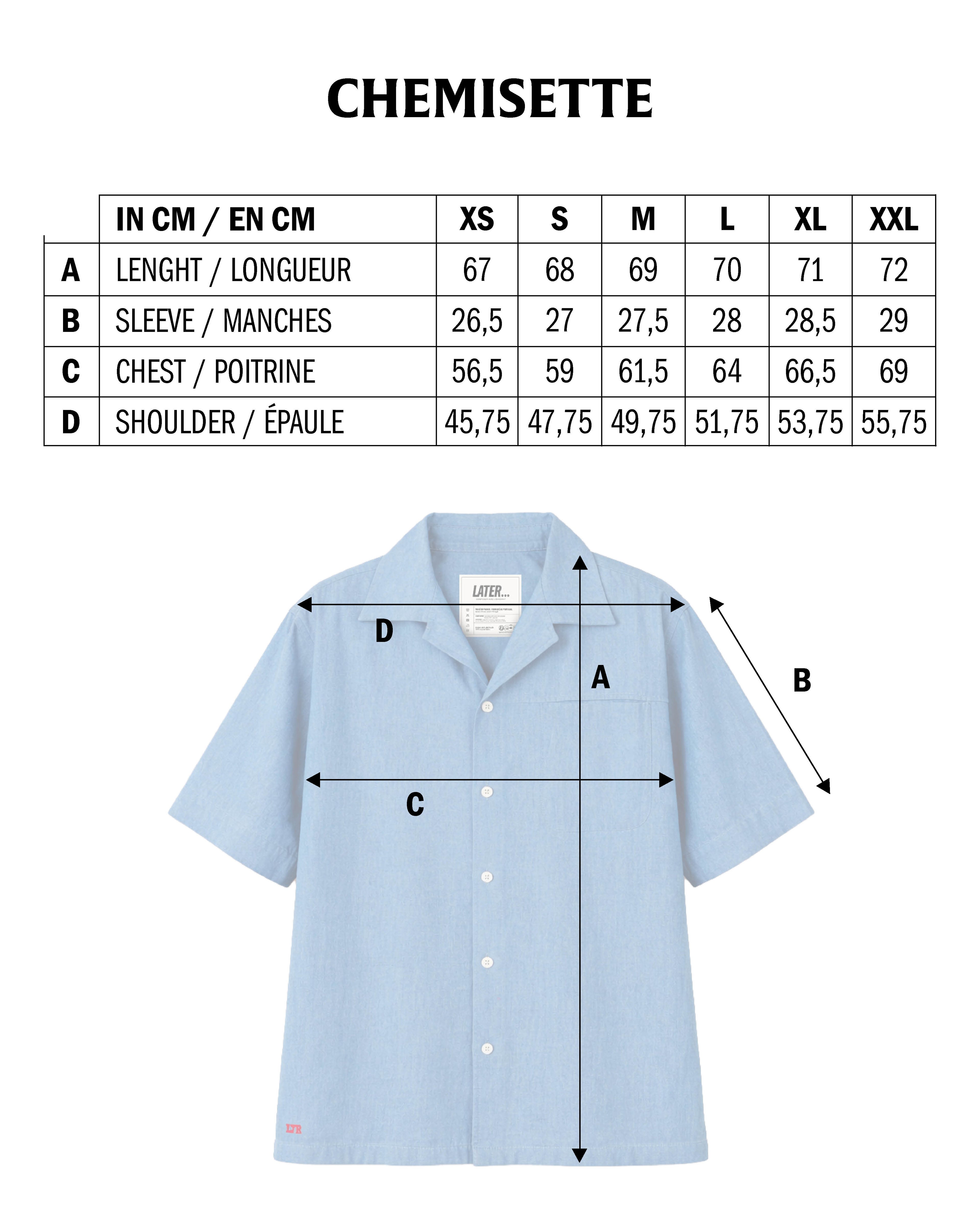 La chemise manches courtes en chambray est une chemise légère en coton. Sa coupe droite et fluide la rend facile à porter au quotidien. Le chambray est un tissu de coton souple et respirant, souvent confondu avec le denim mais plus léger. Son tissage lui donne un aspect légèrement texturé et lumineux.