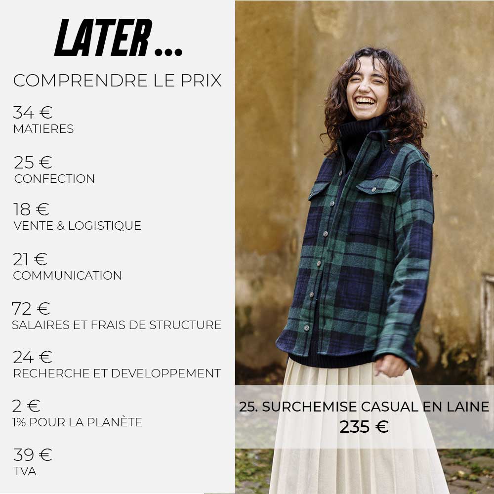 Nous pensons que la transparence totale est une condition nécessaire à une consommation responsable. Le coût des matières, de la confection mais aussi de la logistique et des salaires, on vous explique le prix en détails.