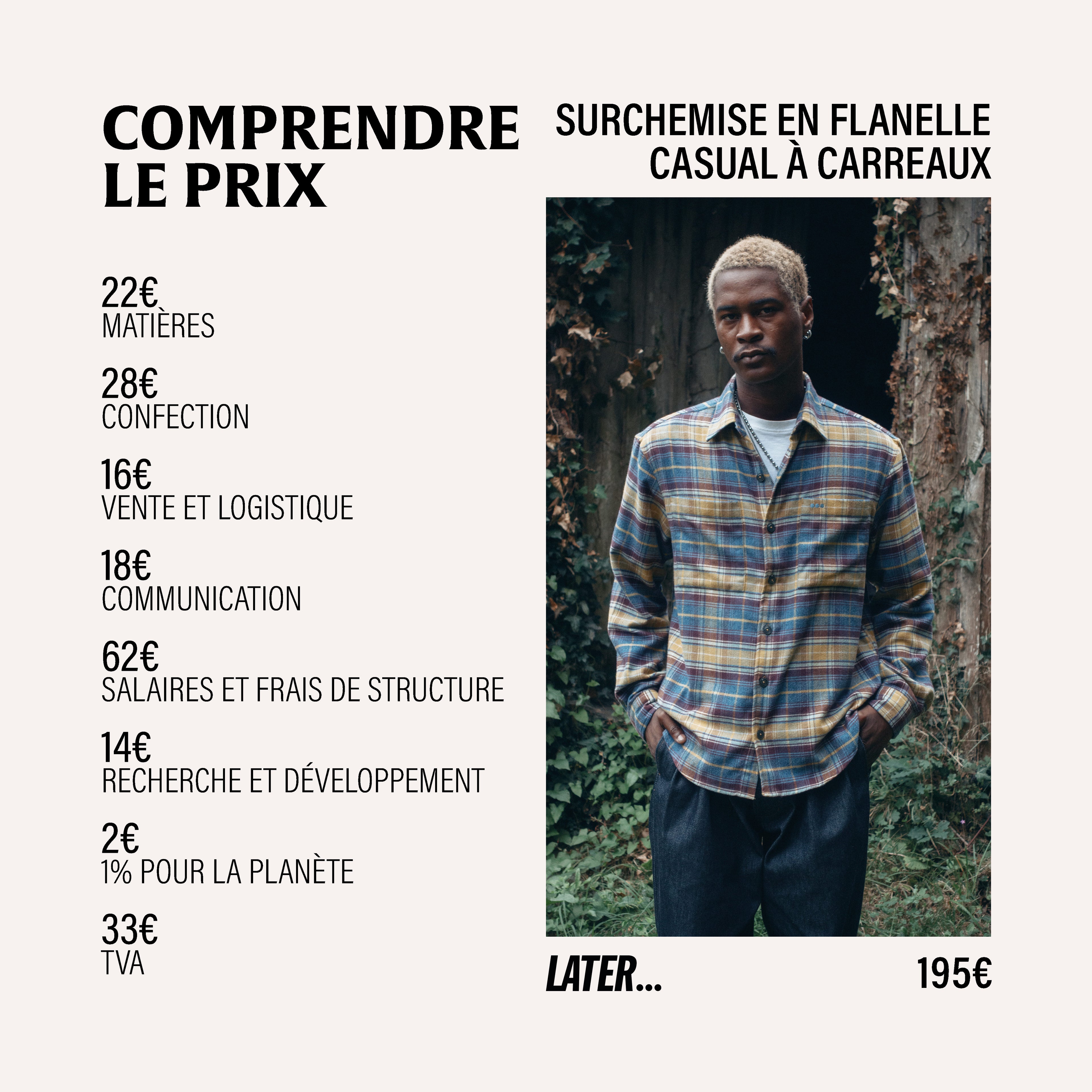 Nous pensons que la transparence totale est une condition nécessaire à une consommation responsable. Le coût des matières, de la confection mais aussi de la logistique et des salaires, on vous explique le prix en détails.
