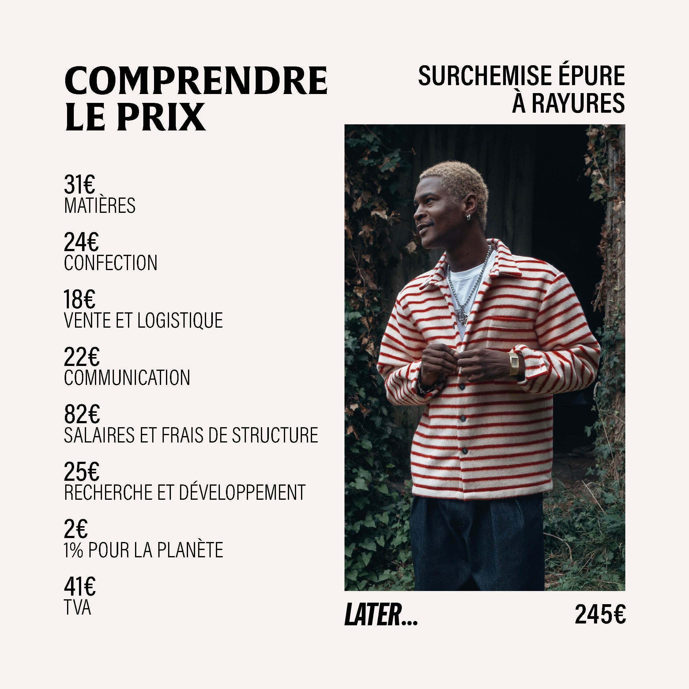 Nous pensons que la transparence totale est une condition nécessaire à une consommation responsable. Le coût des matières, de la confection mais aussi de la logistique et des salaires, on vous explique le prix en détails.